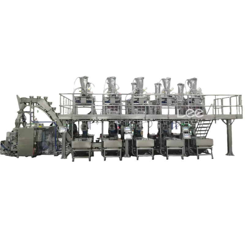 giving bag→coding →opening →filling 1 →filling 2→ auxiliary→ exhaust→heat sealing→ .forming and output product