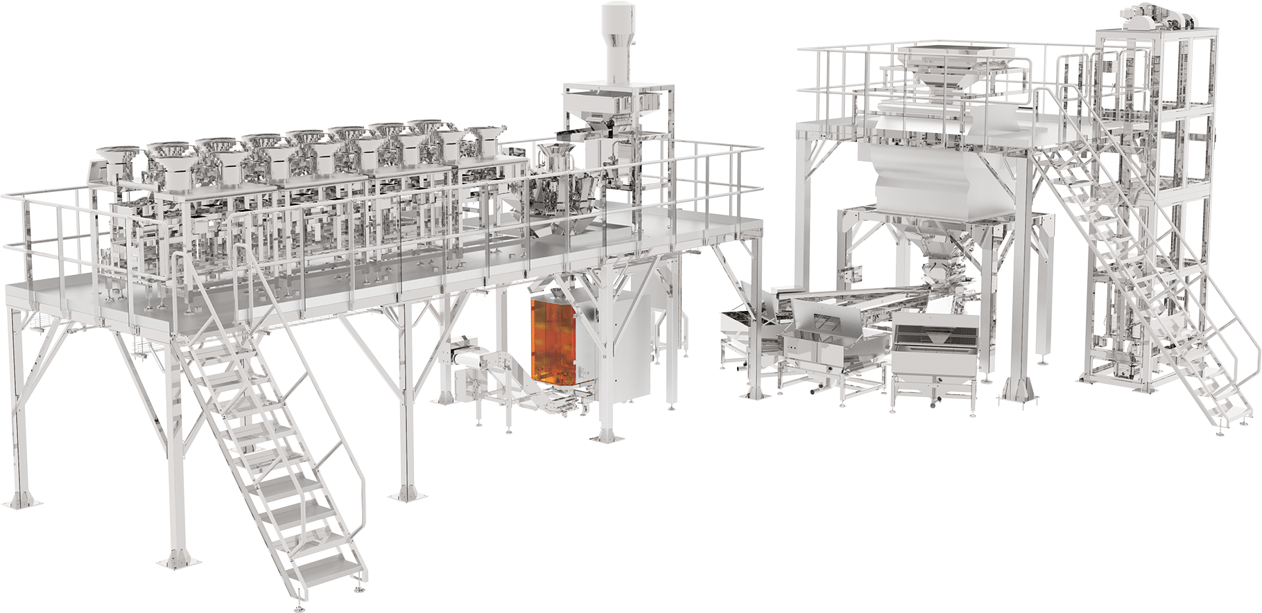 B. Large Output Production Mode: Raw materials are conveyed to the 14 head weigher through the large-flow vacuum feeder, completing high-speed quantitative weighing for mass production. The weighed materials enter the high-speed bag packaging machine to complete automatic packaging, then the paging labeling machine completes product information labeling and traceability coding, and finally qualified mass-produced finished products are output.