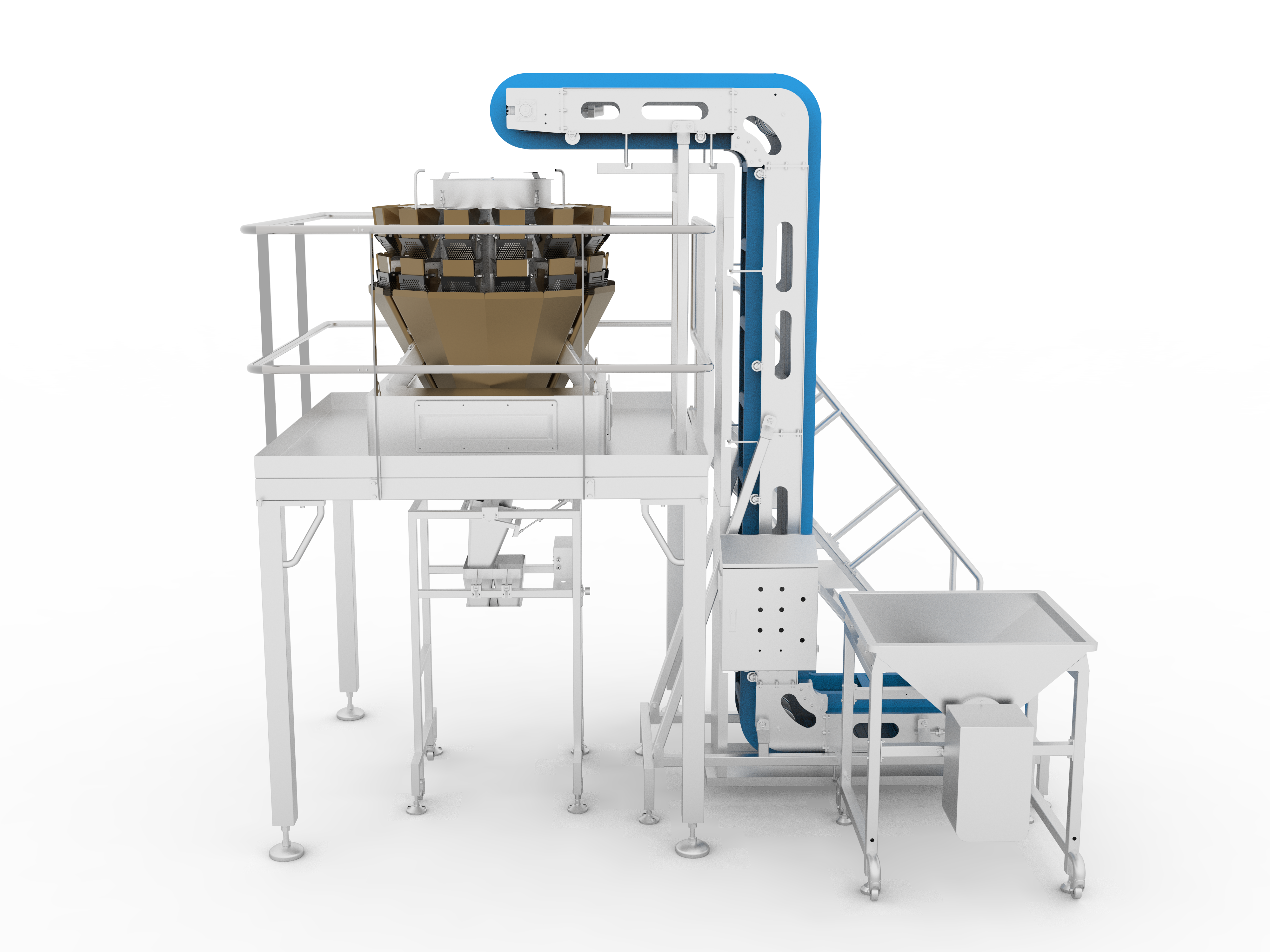 ·The vertical belt elevator gently carries the evenly fed shredded beets to the upper feeding hopper of the screw version multihead weigher, with no material entanglement or damage during conveying.