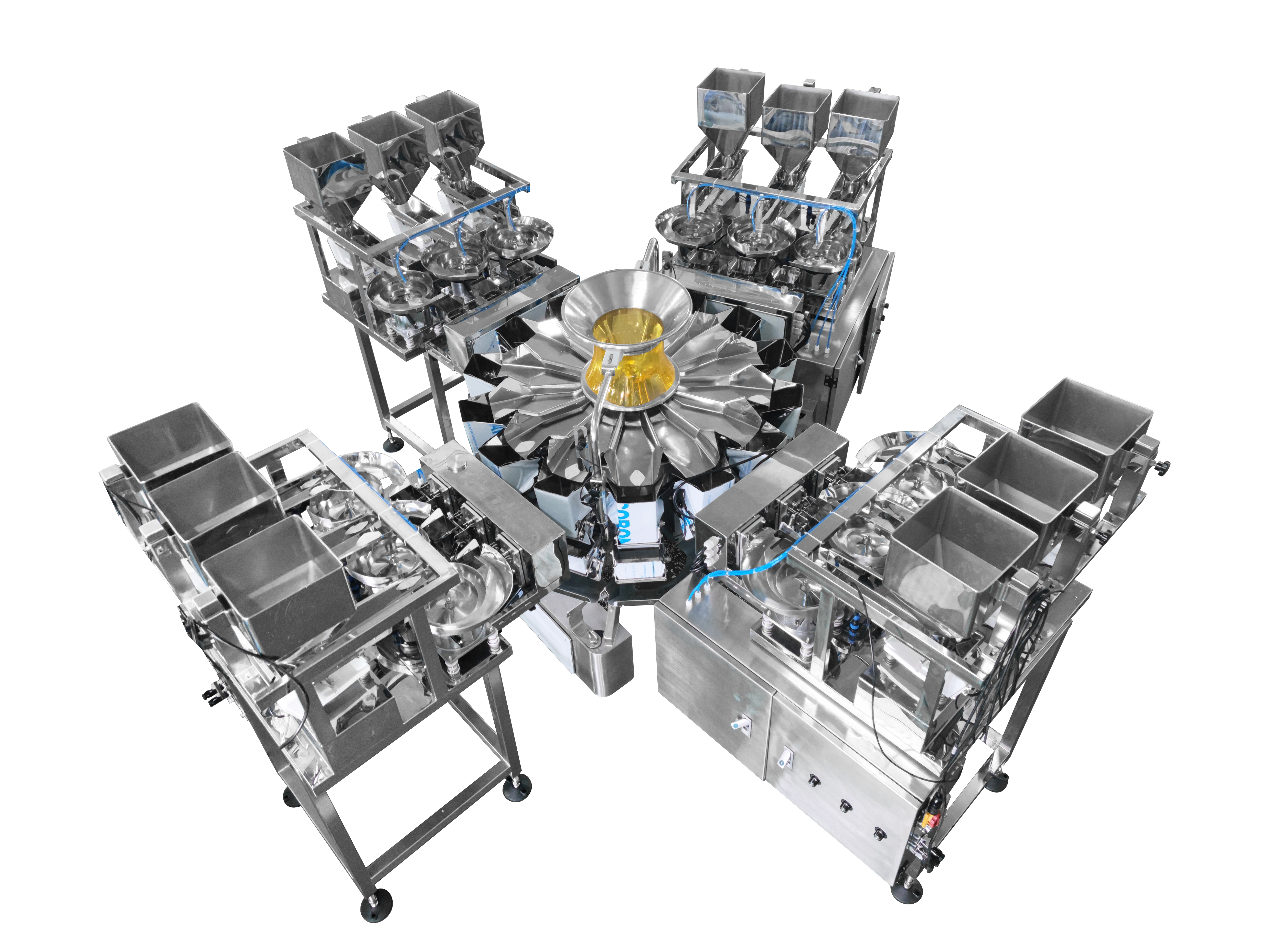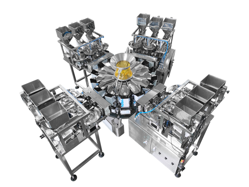 ·Synchronous Quantitative Weighing & Discharging: The 4 sets of 3-head rotary linear weighers and 14-head multihead weigher independently and accurately weigh the 5 types of nut materials (Material A/B/C/D/E) respectively. After receiving the discharging request signal sent by the packaging machine, all weighers discharge the weighed materials into the packaging machine synchronously, to ensure the fixed mixing ratio of each bag.