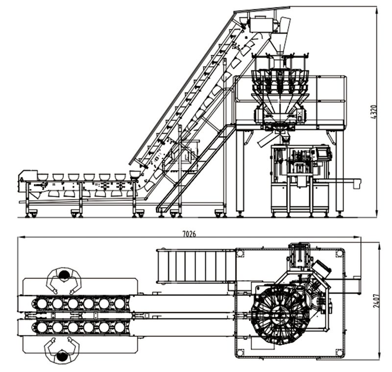 ·Dual-Line Material Feeding & Lifting: Bulk materials are manually poured into the dual inlets of the double line bowl-type elevator, which lifts the materials smoothly and synchronously to the upper feeding hopper of the 14-head multihead weigher, ensuring continuous and uniform material supply.